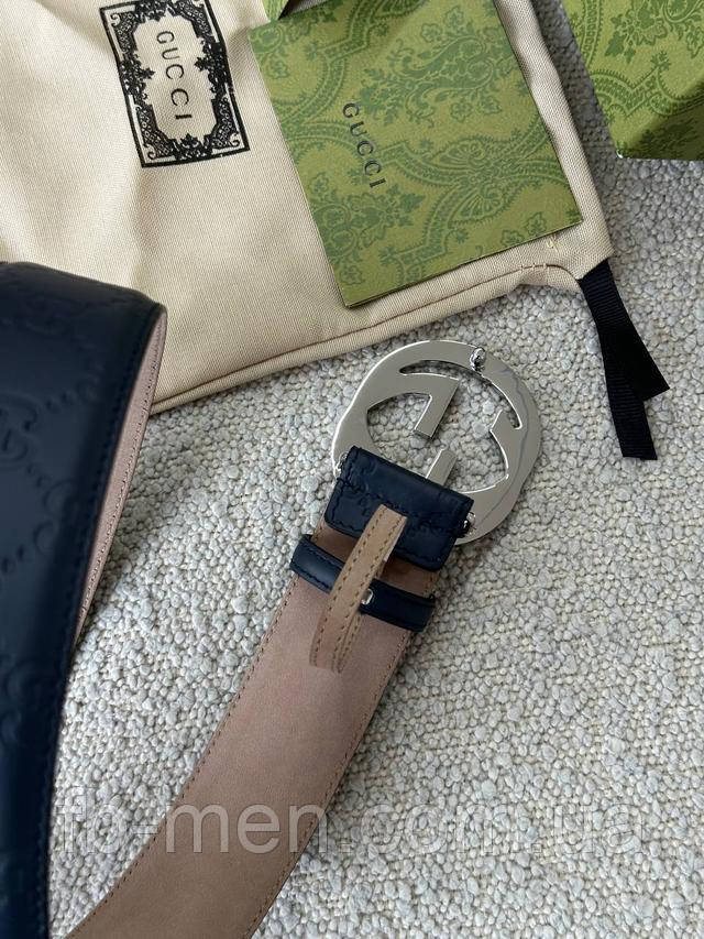 Ремінь шкіряний чоловічий темно-синій зі сріблястою пряжкою преміум'якість